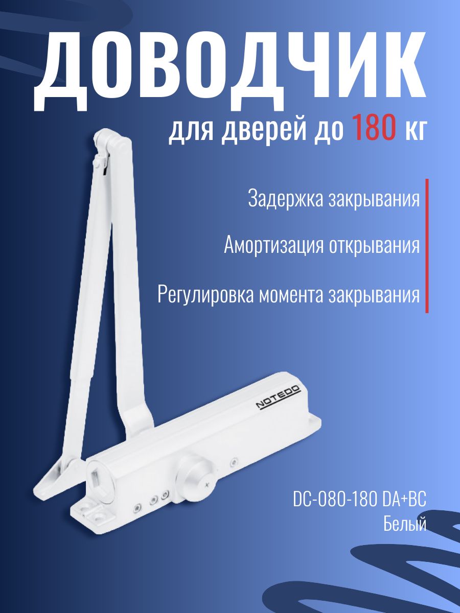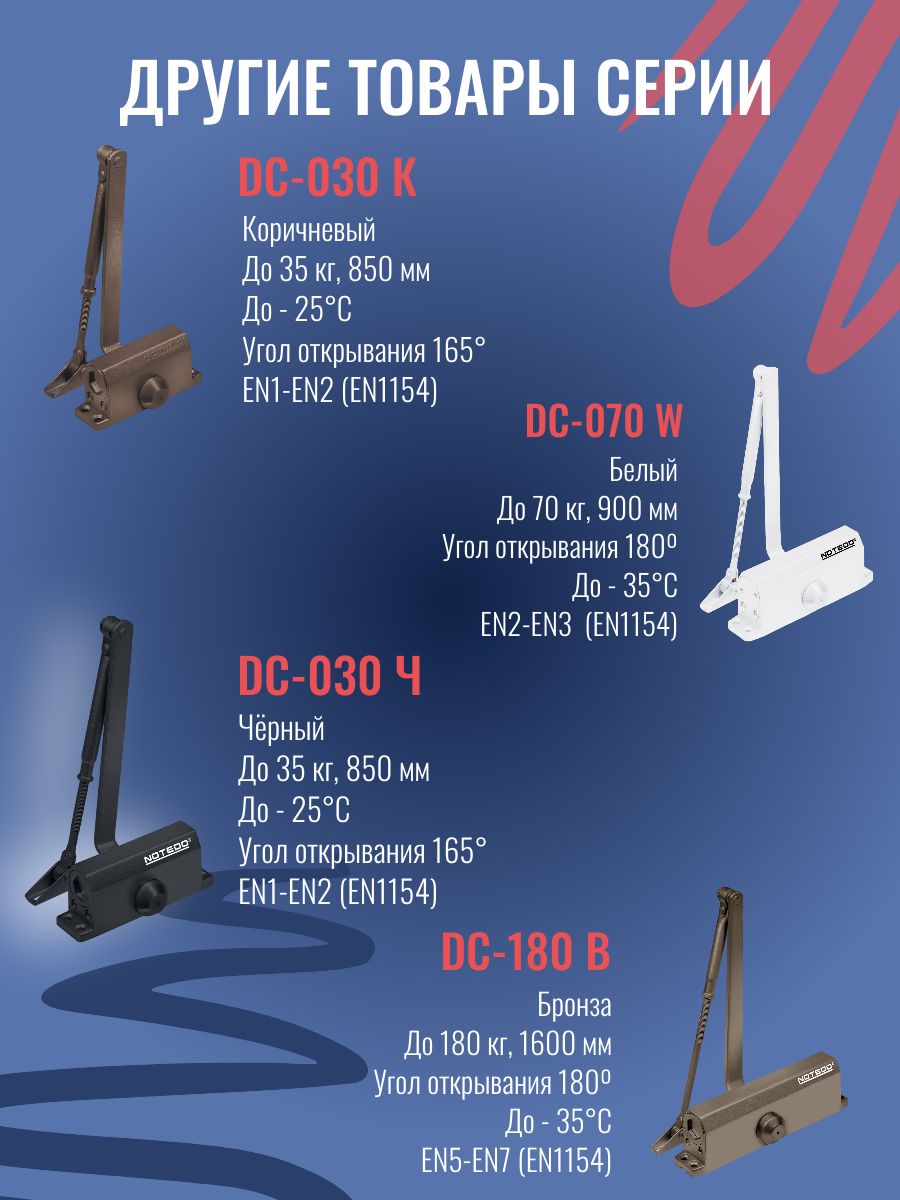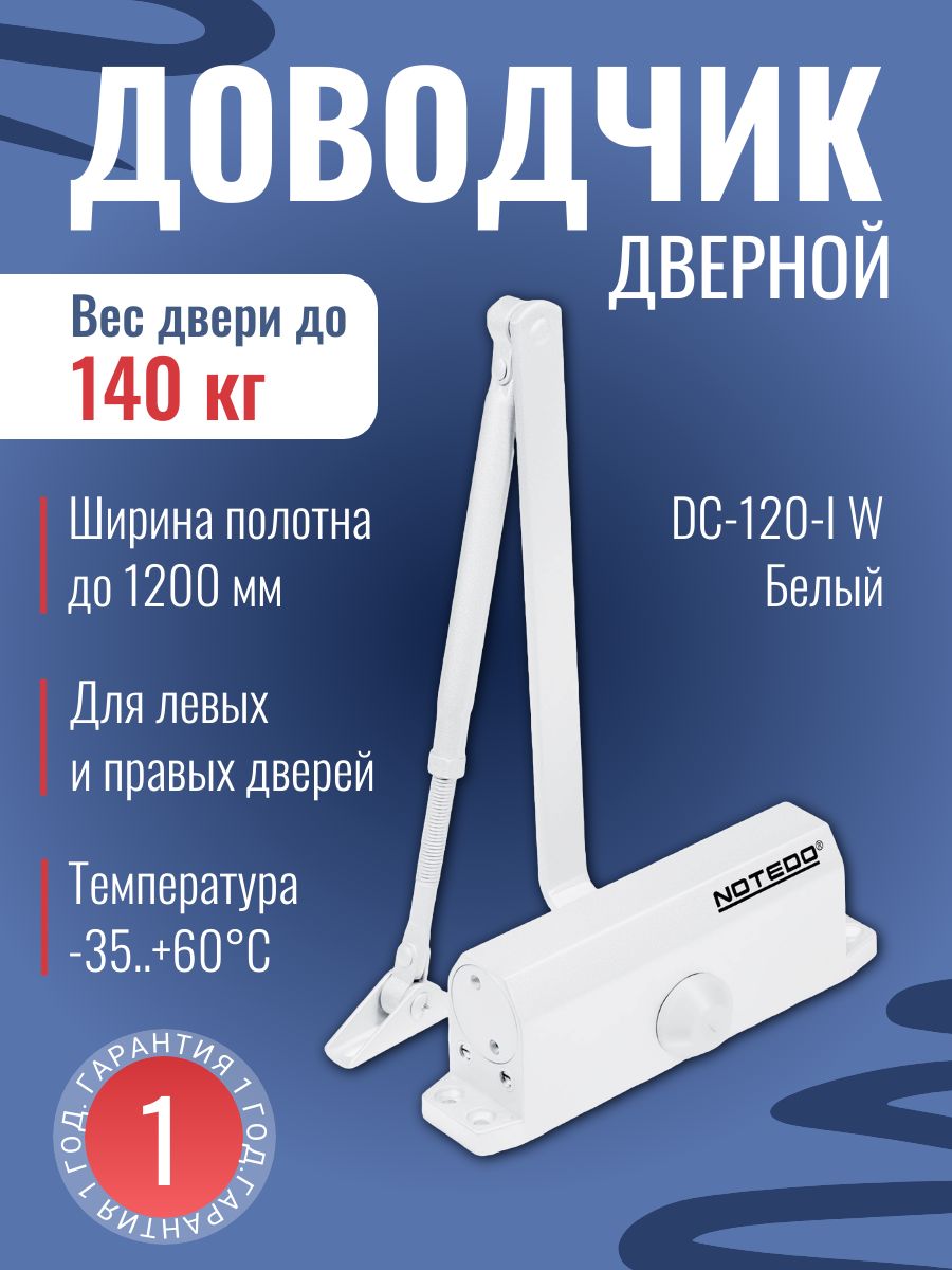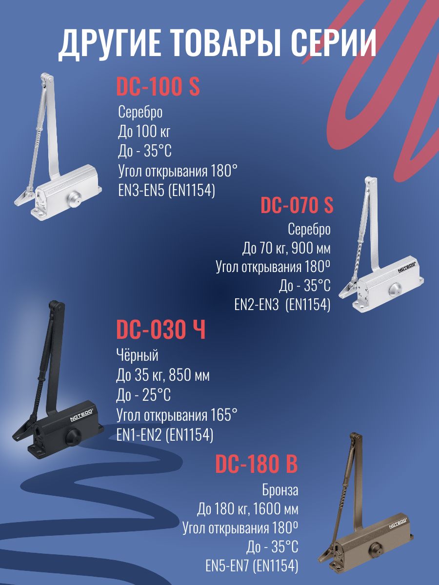 Дверной доводчик NOTEDO DC-060 оборудован складным рычагом и рассчитан на установку на двери массой до 60 килограмм и шириной полотна до 90 см. Предусмотрена плавная регулировка скорости закрывания и доводки двери. Класс усилия устройства — EN2–EN3 по международному стандарту EN 1154. Подходит для эксплуатации в температурном диапазоне от −35°C до +60°C. Посадочные размеры составляют 132–135 × 19 мм. Максимально допустимый угол открытия двери — 180 градусов. Ресурс механизма предусматривает надёжную работу в течение минимум 500 000 циклов открывания/закрывания. Габаритные размеры корпуса доводчика — 150×38×55,5 мм.