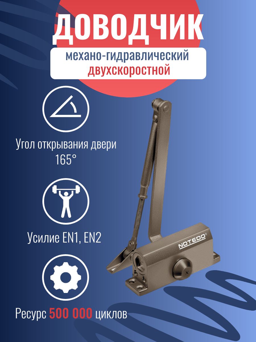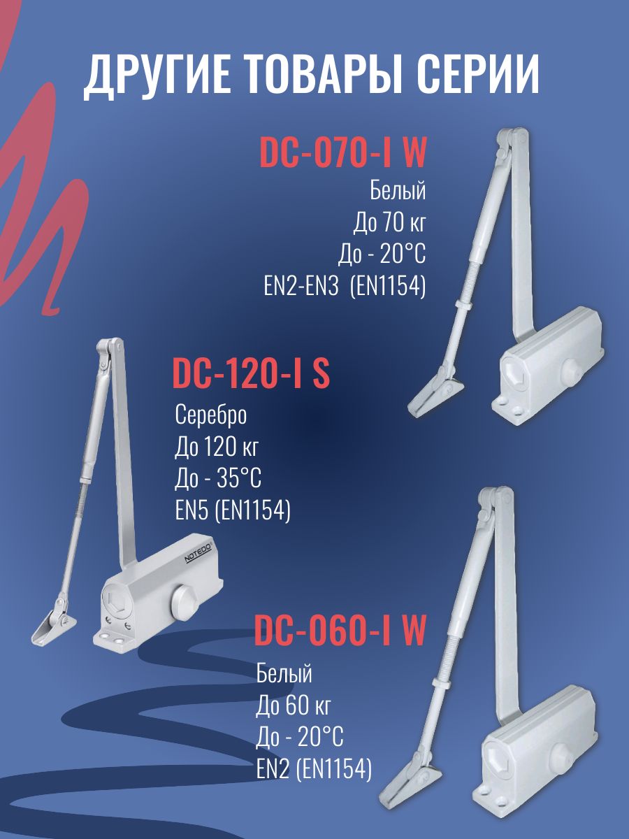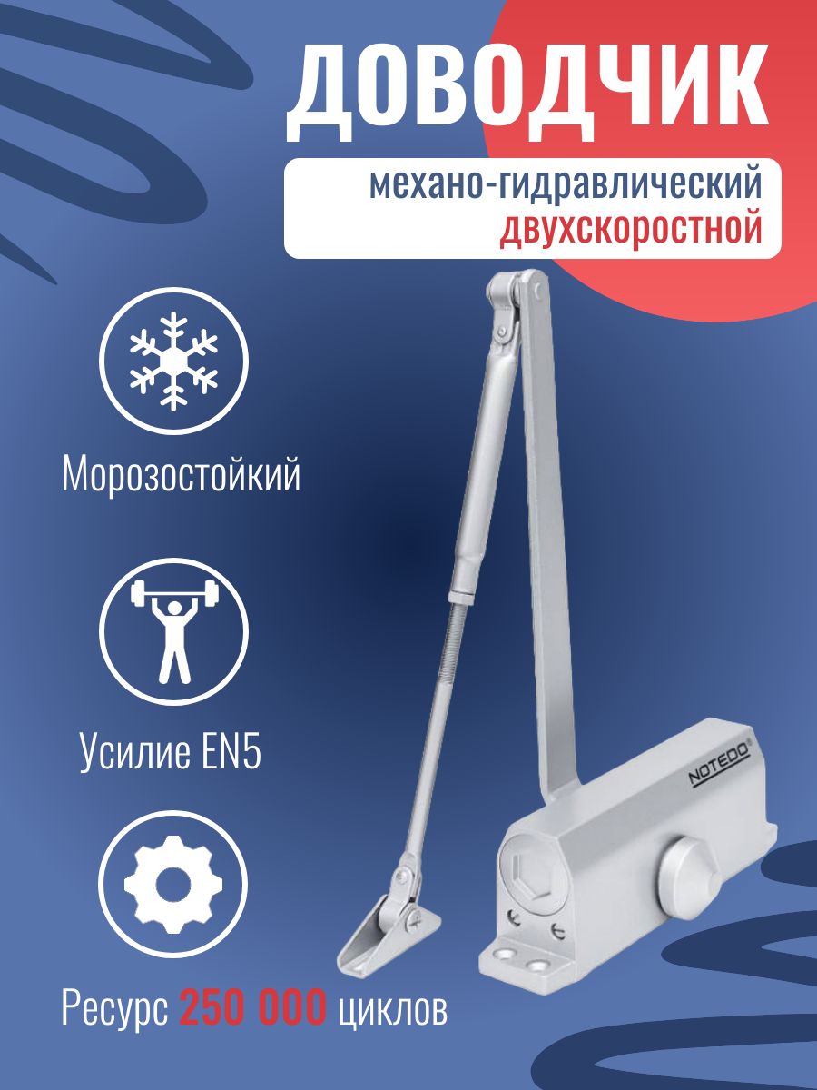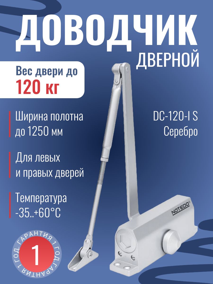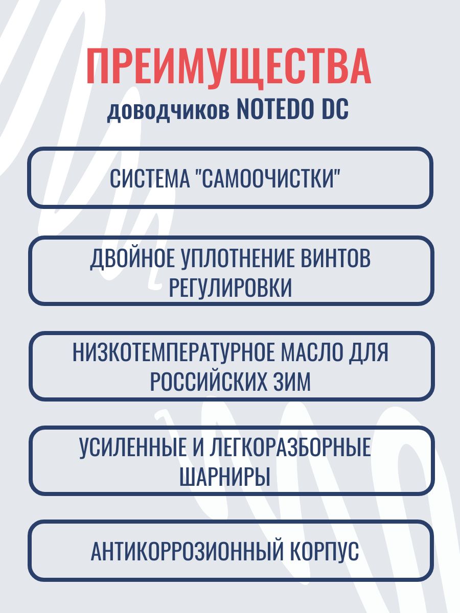 Дверной доводчик NOTEDO DC-060 оборудован складным рычагом и рассчитан на установку на двери массой до 60 килограмм и шириной полотна до 90 см. Предусмотрена плавная регулировка скорости закрывания и доводки двери. Класс усилия устройства — EN2–EN3 по международному стандарту EN 1154. Подходит для эксплуатации в температурном диапазоне от −35°C до +60°C. Посадочные размеры составляют 132–135 × 19 мм. Максимально допустимый угол открытия двери — 180 градусов. Ресурс механизма предусматривает надёжную работу в течение минимум 500 000 циклов открывания/закрывания. Габаритные размеры корпуса доводчика — 150×38×55,5 мм.