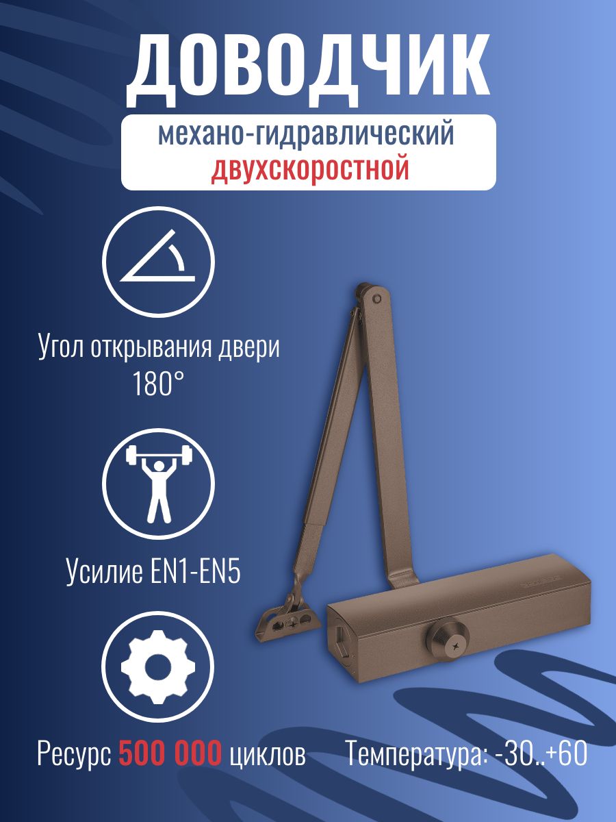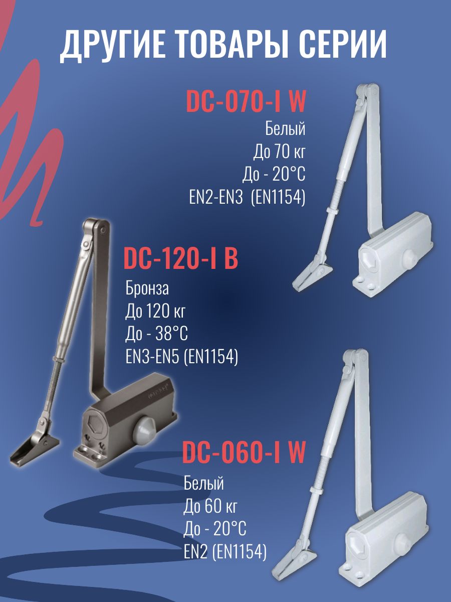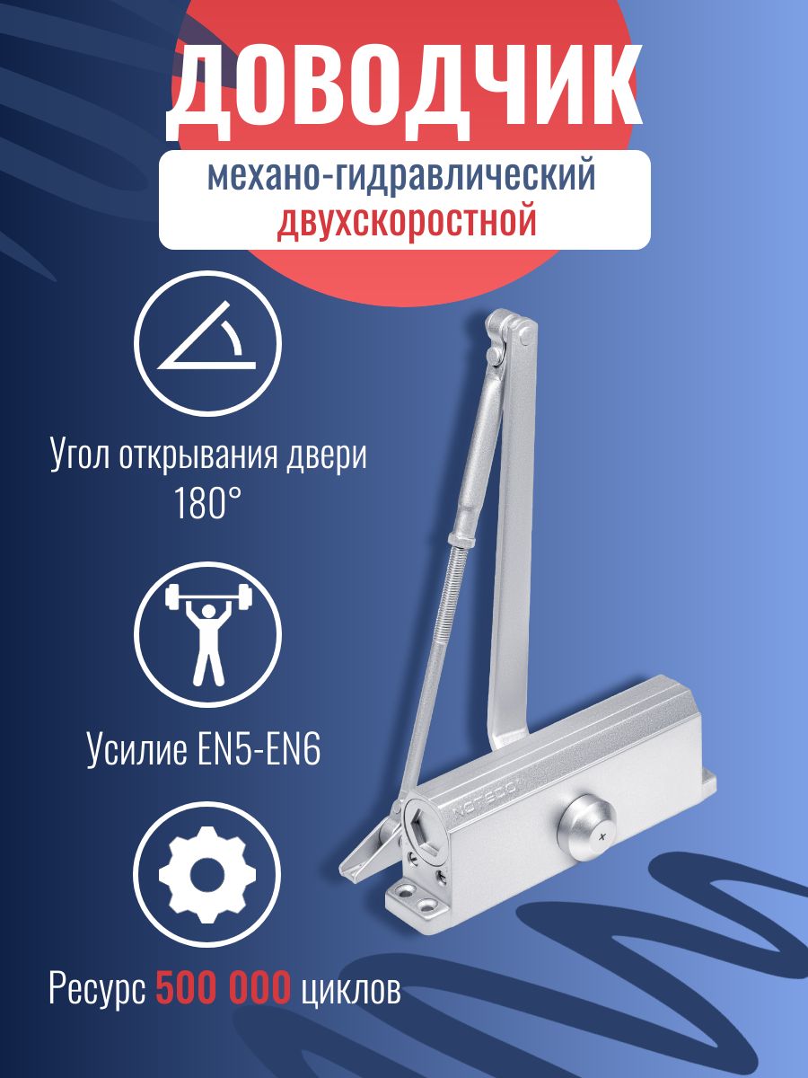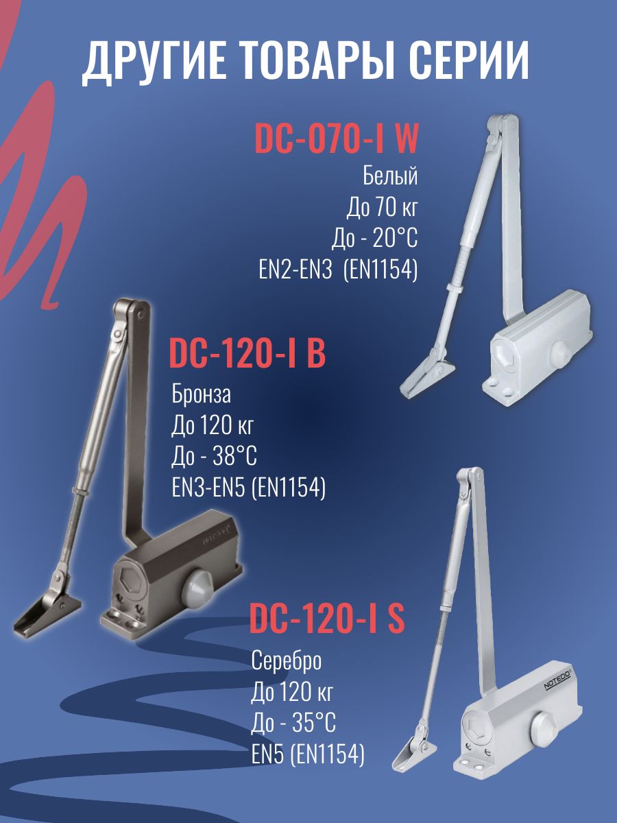 Дверной доводчик NOTEDO DC-060 оборудован складным рычагом и рассчитан на установку на двери массой до 60 килограмм и шириной полотна до 90 см. Предусмотрена плавная регулировка скорости закрывания и доводки двери. Класс усилия устройства — EN2–EN3 по международному стандарту EN 1154. Подходит для эксплуатации в температурном диапазоне от −35°C до +60°C. Посадочные размеры составляют 132–135 × 19 мм. Максимально допустимый угол открытия двери — 180 градусов. Ресурс механизма предусматривает надёжную работу в течение минимум 500 000 циклов открывания/закрывания. Габаритные размеры корпуса доводчика — 150×38×55,5 мм.