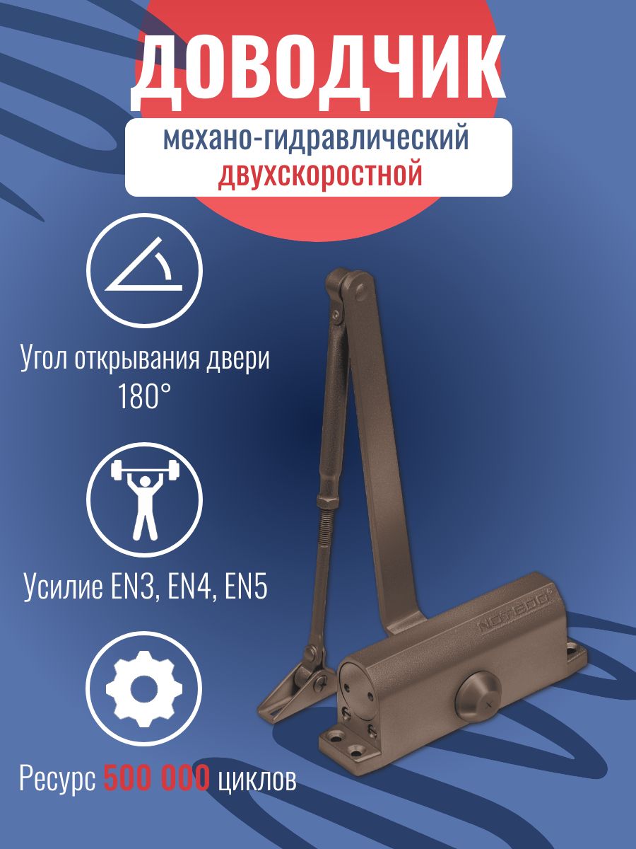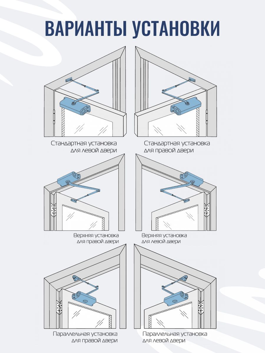 Регулировка скорости закрывания и доводки осуществляется плавно, что повышает комфорт и безопасность при эксплуатации двери. Срок гарантии производителя составляет 2 года. Максимальная величина угла открывания двери достигает 180°, обеспечивающая удобное перемещение крупногабаритных предметов и оборудования.