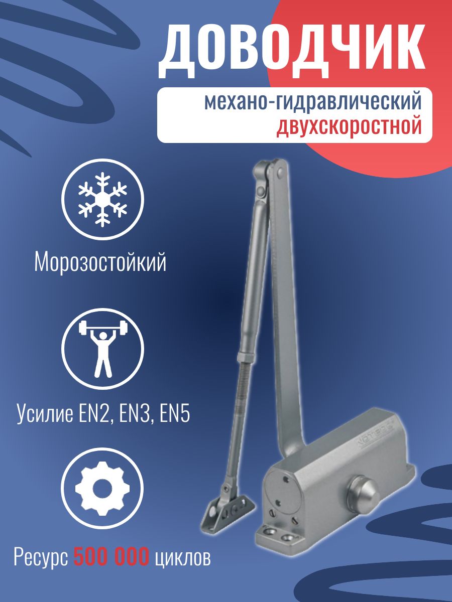 Механизм оснащен складным рычагом, обеспечивая удобство монтажа и обслуживания. Класс усилия доводчика соответствует стандартам EN5–EN7 согласно европейскому нормативному документу EN 1154 и варьируется в зависимости от условий установки.