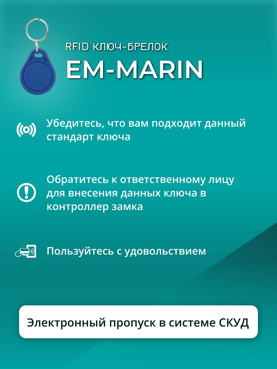 Радиобрелок EM-Marin PW-Key (AT-13) представляет собой миниатюрный электронный ключ домофона, работающий на частоте 125 кГц. Благодаря своим компактным размерам (37х30х3 мм), этот брелок легко помещается в кармане или кошельке, обеспечивая удобство использования. Рабочая температура брелока варьируется от -30°С до +50°С, что делает его пригодным для применения в любых климатических зонах. Режим работы "Read only" гарантирует безопасность данных, так как информация может только считываться, но не изменяться.
