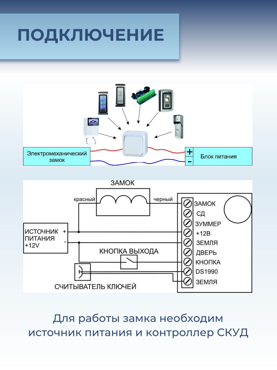 При установке устройства в помещениях, предназначенных для нахождения людей, обязательно использование дополнительного механического элемента отпирания — специального ключа Promix-AD.KM.01, обеспечивающего открытие дверей вручную в экстренных ситуациях вроде пожара или чрезвычайного происшествия.