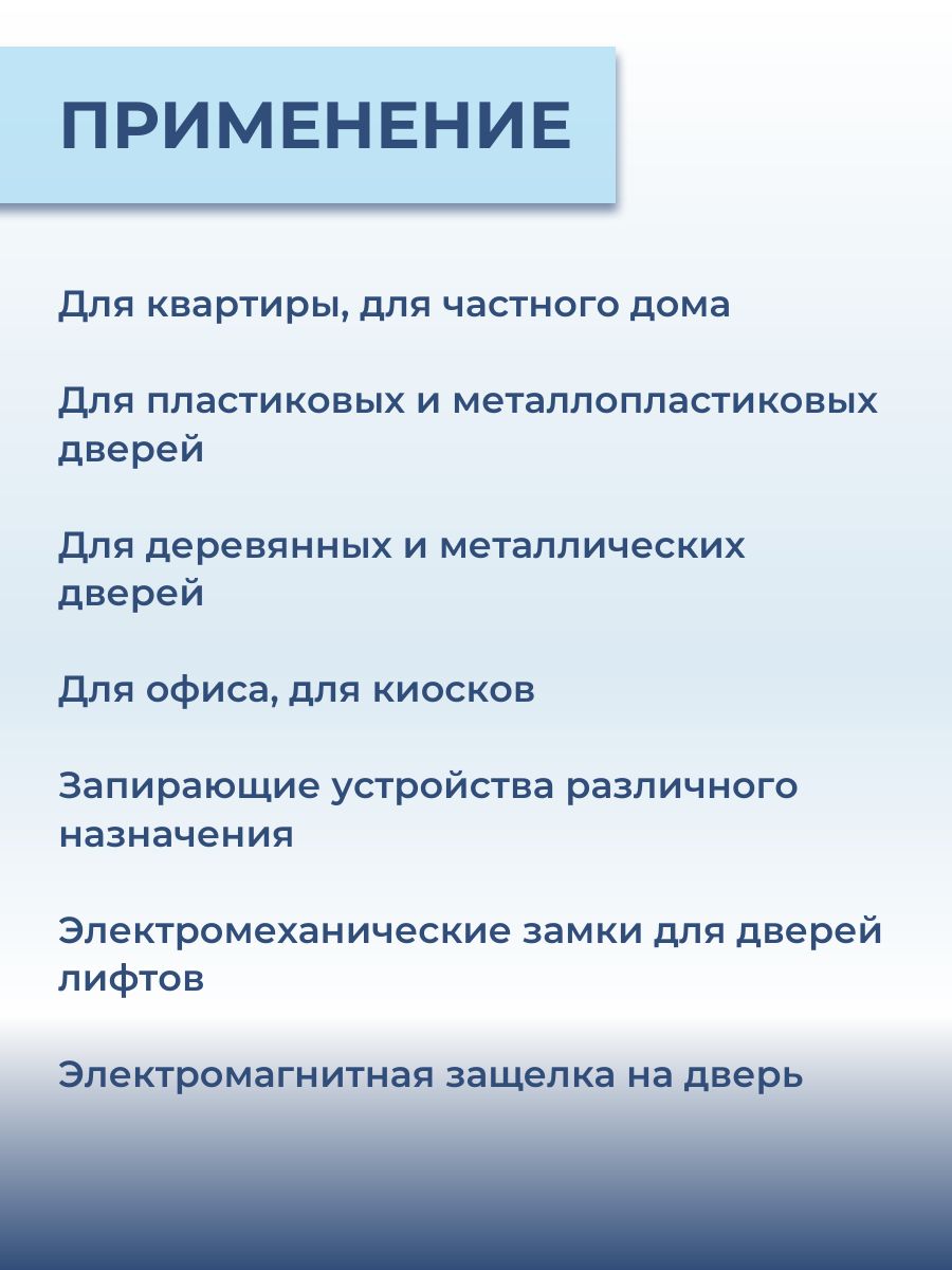 Устанавливается на любые типы дверей — деревянные, металлические, пластиковые, возможна установка с обеих сторон помещения. Крепится корпус замка в угол дверной рамы, а ригель фиксируется непосредственно на полотне двери.