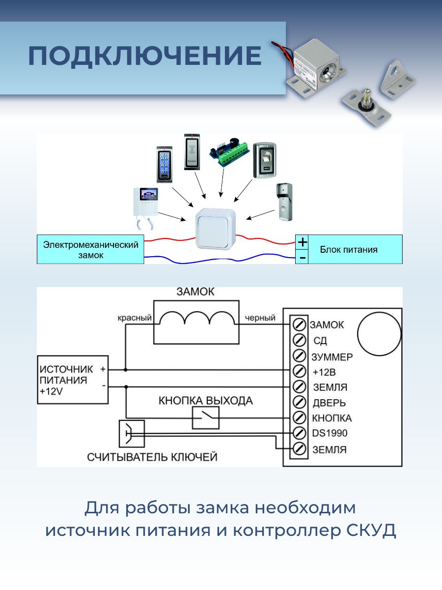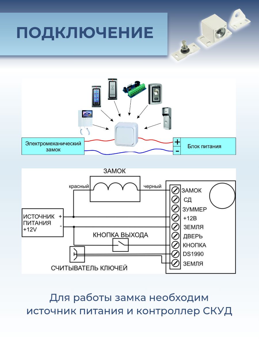 Для случаев отсутствия электропитания замок оснащён функцией аварийного открытия путём вытягивания специального тросика (лески), прикрепленного к якорю. Эта особенность обеспечивает удобство эксплуатации даже при отключении электроэнергии. Монтаж замка возможен практически на любую поверхность — металлическую, деревянную или ламинированную ДСП. Подробности установки и подключения приведены в инструкции, приложенной к устройству.